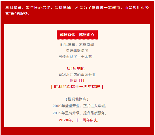 全城沸騰!|| 8月8日值得慶賀的事件太多!阜陽(yáng)華聯(lián)勝利北路店十一周年店慶最香!