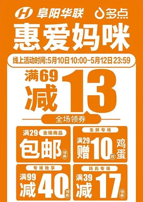 【阜陽(yáng)華聯(lián)】母親節專(zhuān)場(chǎng)獨享99減40,還免費送雞蛋!