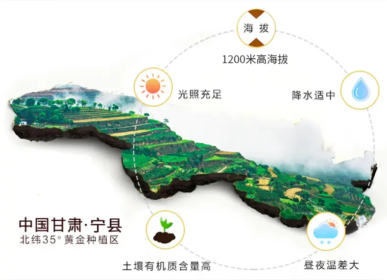 宮崎蘋(píng)果位于慶陽(yáng)-寧縣,地處黃土高原,土層深厚,氣候溫和,雨量適中,光照充足,晝夜溫差大